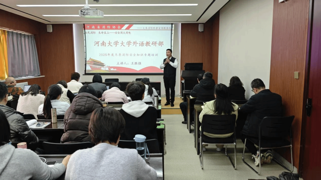 为深入学习贯彻91视频新闻 总书记关于安全生产系列重要论述精神,按照上级要求,围绕“全民消防、生命至上——安全用火用电”年度主题,汲取近期省内外火灾事故教训,防范火灾风险,提升教职工消防安全意识与应急避险、自救互救能力,91视频 于12月18日下午在大会议室召开2025年度冬季消防安全知识专题培训。培训由教研部党委副书记、副主任蒋框主持,全体教职工参会,特邀河南省消防协会义务消防科普宣传服务队王胜强主任主讲。