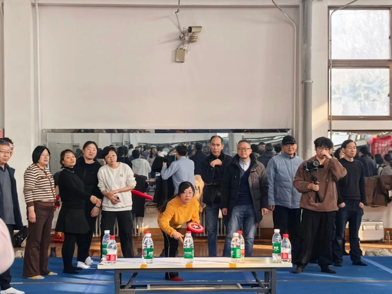 运动会的五个比赛项目设计巧妙,集趣味性、协作性和挑战性于一体,充分考验了老师们的个人技巧与团队默契。作为开场项目,投壶这项古老而优雅的游戏迅速让赛场安静下来。老师们凝神静气,瞄准壶口,沉稳投掷。每一次投中,都引来全场热烈的欢呼与掌声。在踢毽子接力项目中,彩色的毽子在空中划出优美的弧线。这项比赛不仅是个人脚上功夫的展示,更是团队衔接流畅度的考验。老师们身手矫健,配合默契,在完成踢毽与手脑挑战的接力中,将现场气氛推向了一个小高潮。蒙眼转圈再投球无疑是全场笑声最多的项目。老师们蒙上双眼,原地转圈后已是方向难辨,只能依靠队友的声音指引,摸索着将乒乓球投出。此起彼伏的提示声与投偏后的欢笑声交织在一起,深刻体现了团队成员间的信任与扶持。飞盘打水项目中,飞盘在空中旋转飞向目标,每一次精准的命中都伴随着阵阵喝彩。这个项目让老师们在运动中释放了压力,享受了投掷的乐趣与成就感。作为压轴项目,“流星赶月”对团队配合的要求最高。小小的乒乓球在老师们手中的桶间飞速传递,紧张刺激。各队争分夺秒,策略各异,将团队协作精神发挥得淋漓尽致,现场加油声、呐喊声此起彼伏,气氛热烈至极。